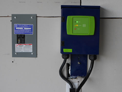 Wide view of the open pull box ![]() Closeup of the inside of the pull box showing the 6 gauge wire connecting the new meter. We took the extra time to install the equipment inside the wall and will repair the stucco around the new boxes. Too many houses look like industrial complexes with surface mount boxes and conduit strapped to the wall. Solar companies are notorius for running ugly conduit down the sides of houses and I did not want that look. Next we installed new drywall and hung the electric vehicle charging station on the wall.